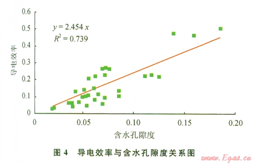 利用上式計(jì)算低阻氣層含水飽和度,關(guān)鍵是確定式中的以a't值,高楚橋利用巖心巖電實(shí)驗(yàn)結(jié)果剖析了導(dǎo)電效率(E)與含水孔隙度(φw)之間的關(guān)系[6-7],二者之間具有良好的線性關(guān)系,由此可以利用研究區(qū)地層溫壓條件下的巖電實(shí)驗(yàn)結(jié)果求得式(7)中的a't值,見(jiàn)圖4。由此可知a't=2.454.