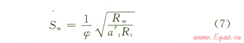 根據(jù)研究區(qū)低阻形成的機(jī)理可知,本區(qū)低阻氣層以細(xì)砂巖、粉細(xì)砂巖為主,顆粒細(xì)、排驅(qū)壓力大、束縛水飽和度較高;低阻氣層中的陽(yáng)離子交換量很低,因而泥質(zhì)的附加導(dǎo)電性可以忽略。因此,對(duì)于這類(lèi)高束縛水飽和度引起的低阻油氣藏可用以下模型計(jì)算含水飽和度:
