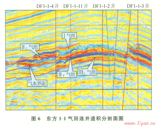 東方l-l鶯二段氣層在地震剖面上具明顯的低頻強振幅特征,原因是高沉積速率的砂泥巖,壓實和成巖作用弱,兩者間密度速度差別很小,砂巖含氣后,速度和密度都大大降低,產(chǎn)生強波阻抗差,形成亮點和AV0異常;高頻吸收明顯,并在氣層較厚、產(chǎn)狀較陡時具平點特征(圖6),這種現(xiàn)象在鶯歌海盆地非常普遍,是識別淺層氣層的重要手段之一。
