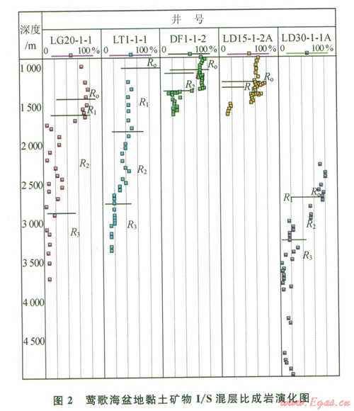 超高溫中央底辟帶的東南區(qū)黏土礦物以綠泥石、伊利石為主;東方區(qū)、樂東區(qū)雖然以伊/蒙混層、伊利石為主,但在熱流體活躍層段出現(xiàn)高嶺石、綠泥石含量異常,如東方區(qū)和樂東區(qū)l 500 m上下出現(xiàn)高嶺石含量增高、綠泥石含量降低異常層段,這是由于大量的C02隨著熱流體從深部向上運移,在中淺層聚集,并溶于水中,碳酸根含量增加,隨后碳酸釋放出H十,使地層水呈酸性,促使綠泥石向高嶺石轉(zhuǎn)化的結(jié)果。另外在熱流體作用下,出現(xiàn)蒙脫石向伊利石轉(zhuǎn)化突變異?,F(xiàn)象,如靠近斷裂的DFl-1-2井(圖3)在1 200~1