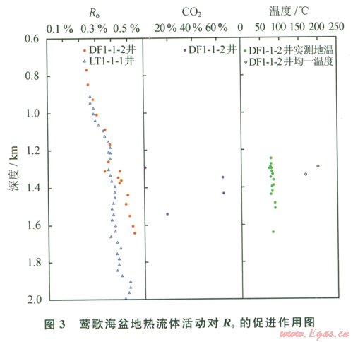 沉積地層中有機物對溫度的變化十分敏感,高溫熱流體活動無疑會加速有機質(zhì)的熱演化速度[7-8]。圖2顯示,在深度相同、時代相近的情況下,鶯歌海盆地DF
