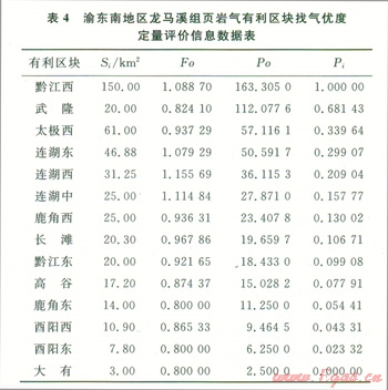 式中Poi表示第i個(gè)有利區(qū)塊的頁巖氣找氣優(yōu)度;Foi表示第i個(gè)有利區(qū)塊頁巖氣平均有利度;Si表示第i個(gè)有利區(qū)塊的面積。