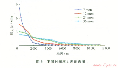 根據(jù)數(shù)值模擬軟件運算結果,繪制典型剖面壓力分布圖,當注入7個月后井底壓力達到28 MPa,壓力逐漸向外為擴散,若假設不注條件下,由于南區(qū)和長北合作區(qū)壓力差的存在,壓力波也會隨時間的延長向外擴散。用以上兩個壓力剖面相減,即可得到壓力剖面上注采過程中不同距離與壓力差之間的關系(圖3)。設置可以觀察的基準壓力值,即可得到不同注采周期下,壓力波的傳播距離在1、2、3年的注氣周期下壓力波傳播距離分別為4. km、6.1 km和7.6 km。