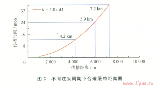 基于理論圖版的可靠性,取南區(qū)與長北邊界處儲層滲透率為4.0 mD時(榆林南區(qū)試井解釋及巖性分析平均滲透率),在不同的儲氣庫注采周期條件下,得到了緩沖區(qū)合理設置距離。在1、2、3年注采周期下,壓力影響半徑分別為4.2 km、5.9 km和7.2 km,這即為合理的緩沖距離(圖2)。