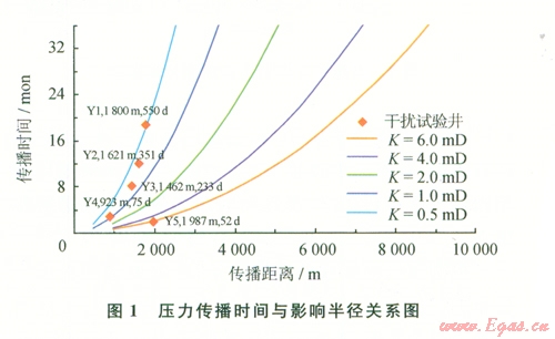 根據(jù)影響半徑計算公式,取榆林南儲氣庫建設區(qū)儲層孔隙度為0.06,天然氣黏度為0.02 mPa·s,綜合壓縮系數(shù)為0.02 MPa-1,分別對滲透率為0.5~6.0mD等不同條件下傳播時問與壓力影響半徑進行計算,繪制壓力傳播時間與距離關系圖版(圖1)。