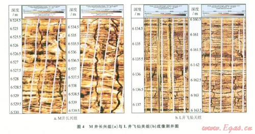 通過大量薄片照片觀察分析,元壩長興組的輸導體主要由白云巖、白云質灰?guī)r儲集體與裂縫構成(圖2-a)。根據(jù)儲層段巖心物性的統(tǒng)計分析(圖3-a),樣品點的滲透率值存在較多異常高值,分析認為與裂縫的發(fā)育情況有關。再結合成像測井來看(圖4-a),長興組礁蓋儲層成像測井動態(tài)圖像表現(xiàn)為塊狀、雜亂、裂縫及孔洞特征,高陡縫發(fā)育,水平縫次之,動態(tài)圖像的色級以黃褐色為主,少部分為亮白色,色級變化范圍較寬,但總體上色級以暗色段為主,故巖性較疏松,物性較好。裂縫與孔隙呈網(wǎng)狀交錯配置,高陡縫可有效溝通上下儲層,水平縫可使相對獨立的孔隙有效連通,從而有助于提高疏導體的立體疏導效率,增強儲層連通性,利于天然氣的有效運移、聚集成藏。
