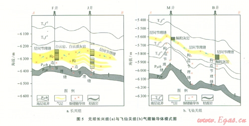 摘 要 四川盆地川東北元壩氣田的氣藏類型為我國埋藏最深、以臺地邊緣礁灘相儲層為主的大型礁灘巖性氣藏,勘探形勢整體較好,然而其海相主要產氣層上二疊統(tǒng)長興組與下三疊統(tǒng)飛仙關組的氣藏規(guī)模差異較大。為找出二者產能差異性的成因,對其儲層、輸導體系、壓力系統(tǒng)及儲源關系等特征進行了地質與成像測井相結合的綜合分析。結論認為:該區(qū)下三疊統(tǒng)嘉陵江組上部一中三疊統(tǒng)雷口坡組膏鹽巖蓋層分布穩(wěn)定,長興組與飛仙關組氣藏氣源均主要來自上三疊統(tǒng)吳家坪組(P2w)和龍?zhí)督M(P