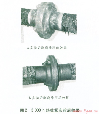 Enviropeel系統(tǒng)符合美國(guó)標(biāo)準(zhǔn)ASTMBll7《熱鹽霧實(shí)驗(yàn)》。圖2為在該標(biāo)準(zhǔn)下測(cè)試3 000 h之后的法蘭表面效果。實(shí)驗(yàn)表明,Enviropeel系統(tǒng)對(duì)其覆蓋范圍內(nèi)的金屬具有良好的防腐效果,而在沒有Enviropeel涂層保護(hù)的地方,如法蘭兩側(cè)連接處,則腐蝕非常嚴(yán)鶯。