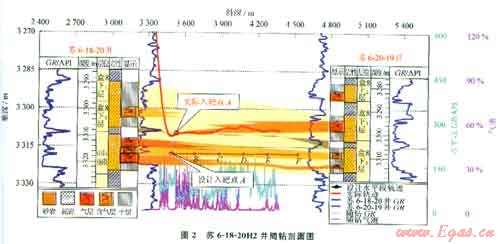 在鉆遇上部砂體頂部時(shí)井斜一般在80°左右,需要穩(wěn)斜基本查明上部氣層情況,如果上部砂層與參照井一致,可繼續(xù)快速下探按原設(shè)計(jì)入靶,而不至于造成過長的無效靶前距。典型井如蘇6-18-20H2井,在鉆遇目標(biāo)砂層組上部單砂體時(shí),砂體厚度變厚,由干層變?yōu)?/span>氣層,后調(diào)整入靶位置在上部單砂體入靶(圖2)。