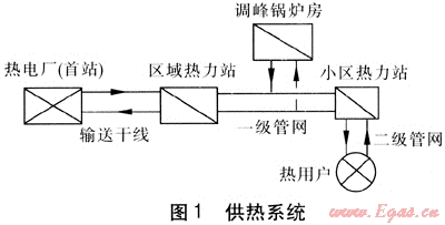 熱源為熱電廠,位于郊區(qū),供熱能力為518MW,熱源出口管道規(guī)格為DN 1000mm。由熱電廠向市區(qū)供熱,輸送干線長(zhǎng)度達(dá)到13.6km,且管道通過地區(qū)地形復(fù)雜,最大高差達(dá)到100m以上。為保證熱網(wǎng)安全穩(wěn)定運(yùn)行,提高供熱介質(zhì)的溫度,降低輸送能耗,將熱網(wǎng)分為三級(jí),供熱系統(tǒng)見圖1。輸送干線設(shè)計(jì)供回水溫度為130、70℃,一級(jí)管網(wǎng)設(shè)計(jì)供回水溫度為120、65℃,二級(jí)管網(wǎng)設(shè)計(jì)供回水溫度為85、60℃。供熱輸送干線距離長(zhǎng)、管徑大、壓力、溫度較高,對(duì)可靠性要求較高。因此,在方案設(shè)計(jì)上,除了靜態(tài)水力分析合理可行外,還應(yīng)進(jìn)行動(dòng)態(tài)水力分析,避免出現(xiàn)重大事故。