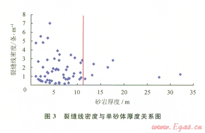 低孔隙度、低滲透率滲砂巖儲(chǔ)層的厚度也是影響裂縫發(fā)育的重要因素。由于厚層砂巖的總體強(qiáng)度比薄層砂巖的總體強(qiáng)度大,抵抗外力破壞的能力強(qiáng)。如果其他條件一致的話,薄層比厚層有更高的裂縫密度,裂縫的線密度也比較大。從本區(qū)裂縫發(fā)育與砂巖厚度關(guān)系可以看出,單砂層厚度在