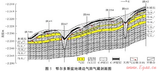 生儲蓋組合大型化發(fā)育是指烴源巖、儲集層與蓋層在三維空間通過緊密的面狀接觸,或通過各種通道的連接而形成的生、儲、蓋組合體大規(guī)模分布。由于烴源巖與儲集體群的大型化發(fā)育,因而組合的規(guī)模也呈大型化分布。中國陸上大型含油氣盆地與中低豐度油氣資源大型化成藏有關(guān)的生儲蓋組合類型主要有4種(見圖4):①廣覆式組合,即烴源巖在下,儲集體在上,二者以席狀方式大面積緊密接觸,規(guī)模相當(dāng)大。這類組合以鄂爾多斯盆地石炭-二疊系海陸過渡相煤系碎屑巖組合最為典型,儲集體群整體覆蓋于烴源灶之上,這為天然氣從烴源巖排出以后,整體規(guī)模進(jìn)入儲集體群并大型化成藏創(chuàng)造了極為有利的條件。②三明治式組合,即烴源巖與儲集體以間互方式緊密接觸,大規(guī)模分布。這類組合以四川盆地上三疊統(tǒng)須家河組最典型,須一、三、五段為主要?dú)庠磶r,而須二、四、六段是主要儲集層,二者間互發(fā)育,分布面積達(dá)11.3×104km2。氣源巖排出的烴類可規(guī)模進(jìn)入鄰近儲集體并大范圍成藏。③轉(zhuǎn)接式組合,是指烴源灶與儲集體并不直接接觸,而是通過呈網(wǎng)狀分布的斷層和面狀分布的不整合與儲集體群相聯(lián)系以保證油氣發(fā)生規(guī)模運(yùn)聚的一類生儲蓋組合。這類組合以塔里木盆地塔中和塔北隆起斜坡區(qū)的奧陶系一間房組、良里塔格組和鷹山組為代表。④倒灌式組合,是指烴源巖以“鍋蓋”方式,覆蓋于儲集體之上,上覆烴源巖形成的油氣以倒灌方式進(jìn)入下伏儲集體并大型化成藏。這也是一類規(guī)模相當(dāng)大的儲蓋組合,以鄂爾多斯盆地中部奧陶系馬家溝組為代表(見圖5),石炭-二疊系煤系烴源灶直接覆蓋于馬家溝組風(fēng)化殼儲集層之上,天然氣呈倒灌方式進(jìn)入下伏儲集體成藏。目前僅靖邊氣田就已發(fā)現(xiàn)氣藏近160個(gè),控制含氣面積約1.0×104km2,探明天然氣地質(zhì)儲量4337×108m3、基本探明地質(zhì)儲量330×108m3,控制天然氣儲量2087×108m3,三級地質(zhì)儲量達(dá)6754×108m3。