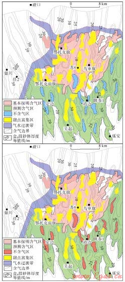 大面積成藏組合是指受連續(xù)性較好、油氣源供給充足的烴源灶控制的一類成藏組合,這類組合主要分布于鄂爾多斯盆地石炭-二疊系的海陸過渡相砂巖層系中。此外,一些鄰近主力氣源灶的碎屑巖層系,也有發(fā)育這類組合的可能性,如準(zhǔn)噶爾盆地環(huán)瑪納斯湖生烴中心的二疊系佳木河組、夏子街組和烏爾禾組,鄂爾多斯盆地靠近烴源灶的太原組,四川盆地鄰近川西主力氣源灶的上三疊統(tǒng)須家河組,以及須一、三、五段主力氣源巖層系內(nèi)部的砂巖體等。
