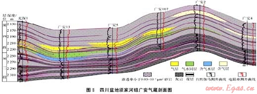 大范圍成藏組合是指“甜點(diǎn)”富集油氣,而成藏范圍很廣的一類成藏組合。這類組合主要形成于三明治式組合和倒灌式組合之中,以四川盆地川中地區(qū)須家河組和鄂爾多斯盆地中部奧陶系馬家溝組巖溶風(fēng)化殼代表??碧浇沂?,單一有經(jīng)濟(jì)性的油氣聚集范圍有限,但平面上由數(shù)十乃至上百個(gè)油氣藏散布于廣闊的區(qū)域內(nèi),油氣藏之間多被水區(qū)、致密區(qū)構(gòu)成的“天窗”阻隔,具有斑塊狀成藏特征。研究表明,導(dǎo)致成藏分布不連續(xù)的原因有二:①烴源灶分布不均勻、供烴總量不充分,近源儲集體優(yōu)先成藏;②儲集體的連續(xù)性較差,導(dǎo)致形成的油氣藏在很大的范圍內(nèi)呈星羅棋布式分布。如四川盆地須家河組氣藏(見圖8),由于須一、三、五段煤系源巖的連續(xù)性平面變化較大,一些區(qū)域煤系烴源巖明顯減薄甚至缺失,致使與之接觸的須二、四、六段儲集層中含氣飽和度與資源豐度平面上有明顯變化,煤系烴源巖減薄區(qū)(俗稱“天窗區(qū)”)成藏機(jī)率低,而優(yōu)質(zhì)烴源巖和有效儲集層疊置區(qū)是天然氣的主要富集區(qū),形成的氣藏儲量豐度與含氣飽和度相對較高。