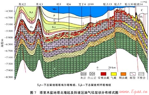似層狀成藏是碳酸鹽巖巖溶縫洞型儲集層的主要成藏樣式??死ㄅ璧乩^承性古隆起圍斜部位受風(fēng)化巖溶以及順層、層間巖溶作用的綜合影響,廣泛發(fā)育似層狀分布的巖溶縫洞型儲集層,當(dāng)充注油氣后,就形成了似層狀油氣分布格局。以塔里木盆地塔北隆起斜坡區(qū)奧陶系一間房組、鷹山組和良里塔格組成藏為例,多種巖溶作用形成的縫洞體數(shù)量多達(dá)數(shù)百甚至上千個(gè),每個(gè)縫洞單元都是一個(gè)相對獨(dú)立的油氣聚集單元(見圖7)。多套似層狀分布的油氣藏群可以形成大油氣田,如塔河油田、哈拉哈塘油田等,地質(zhì)儲量規(guī)模在數(shù)億噸甚至數(shù)十億噸。
