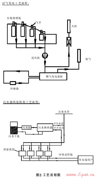 以水源熱泵技術(shù)為基礎(chǔ),結(jié)合其它新能源技術(shù)和建筑技術(shù),我們認為可以將污水源熱泵、沼氣和燃氣發(fā)電技術(shù)結(jié)合應(yīng)用,并進行相關(guān)工藝技術(shù)和設(shè)備的研發(fā)。