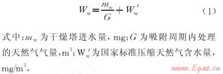 根據(jù)上述已知條件計算可得,在吸附周期(處理天然氣,使其含水量符合國家標準的連續(xù)工作時間)內(nèi),干燥塔最多可吸附45kg的水(分子篩動態(tài)吸附量為靜態(tài)吸附量的10%)。由式(1)可得,改造前工藝來氣含水量908mg/m3,改造后工藝來氣含水量53mg/m3。