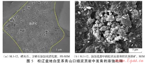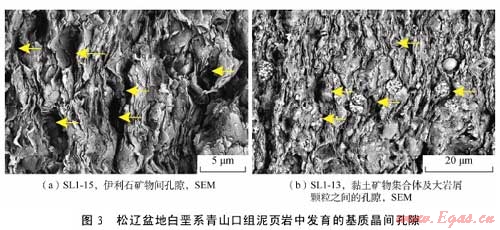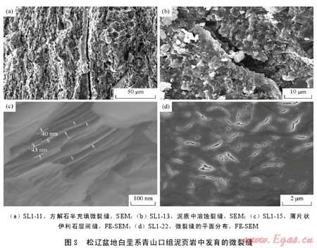 利用掃描電鏡和場發(fā)射掃描電鏡二次電子成像技術對松遼盆地主要生油層白堊系青山口組泥頁巖中發(fā)育的孔隙和微裂縫進行了系統(tǒng)的成像觀察,發(fā)現(xiàn)該套頁巖中主要發(fā)育了5種類型孔隙即基質(zhì)晶間孔、有機質(zhì)孔、溶蝕孔、粒間孔、晶內(nèi)孔及微米—亞微米級(納米級)微裂縫,微裂縫包括充填縫、溶蝕縫及層間縫。各種類型孔隙與微裂縫伴生發(fā)育,并可能彼此連通。這種復雜微裂縫網(wǎng)絡-孔隙系統(tǒng)的存在為油氣從烴源巖向外排驅(qū)提供了有效通道,同時也為滯留在泥頁巖中的部分油氣提供了有效的儲集空間。該套地層中各類型孔隙尺寸為納米—微米級,可能主要受頁巖基質(zhì)的微觀孔隙結(jié)構、礦物組成、有機質(zhì)類型以及有機質(zhì)的熱演化程度等因素的影響。