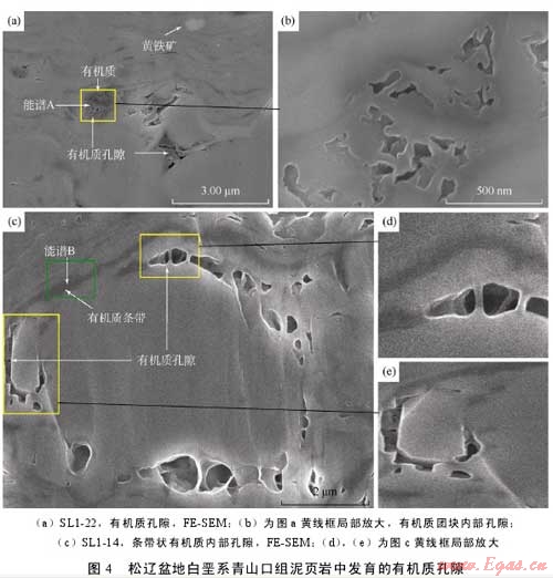 有機質(zhì)孔隙主要指有機質(zhì)團塊內(nèi)部或有機質(zhì)生烴后內(nèi)部殘留的孔隙。圖4為場發(fā)射掃描電鏡二次電子成像后觀察到的泥頁巖樣品中的有機質(zhì)孔隙,圖4a為有機質(zhì)團塊中的孔隙(圖4a中黃線標出的黑灰色區(qū)域A區(qū)對應的元素能譜見圖9a),孔徑為101500nmz已經(jīng)向烴類轉(zhuǎn)化,伴隨這一地質(zhì)過程,泥頁巖中產(chǎn)生大量有機質(zhì)生烴后的殘留孔隙,若泥頁巖處于高—過成熟階段,有機質(zhì)生烴后的殘留孔隙數(shù)量會大幅增加,其孔徑也會變大。