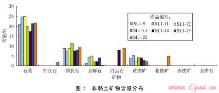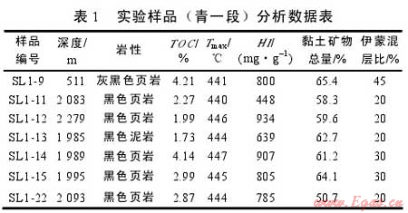 實驗樣品取自松遼盆地北部齊家古龍凹陷、三肇凹陷白堊系青山口組一段泥頁巖(見圖1)。實驗樣品有機質(zhì)豐度較高(見表1),有機碳含量平均2.89%;有機質(zhì)類型以Ⅰ、Ⅱ1型為主,氫指數(shù)一般在639934mg/g;樣品主要處于中成巖作用階段,伊蒙混層比平均26.4%。全巖分析實驗表明,樣品中黏土礦物含量較高,為50.7%65.4%,平均60.3%,其次為石英(17.5%25.0%)、斜長石(7%12%)、黃鐵礦(3%6%)、方解石(1%5%),此外還有少量的鉀長石、白云石和菱鐵礦,不含赤鐵礦和方沸石(見圖2)。