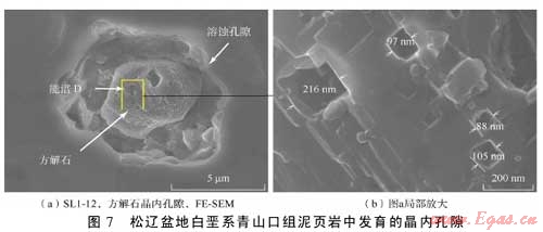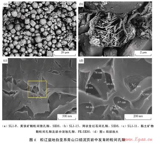 摘 要:為了查明泥頁巖系統(tǒng)微觀孔隙發(fā)育特征及其油氣地質(zhì)意義,利用掃描電鏡及場發(fā)射掃描電鏡二次電子成像技術對松遼盆地白堊系青山口組一段泥頁巖中的微觀孔隙進行了系統(tǒng)觀察。該套泥頁巖中主要發(fā)育了5種類型孔隙,即基質(zhì)晶間孔、有機質(zhì)孔、溶蝕孔、粒間孔、晶內(nèi)孔;此外,還發(fā)育大量微米—亞微米級(納米級)微裂縫,包括溶蝕縫、充填縫及層間縫3類。微孔隙和微裂縫構成復雜微裂縫網(wǎng)絡-孔隙系統(tǒng),為烴源巖生成的油氣向外排驅(qū)提供了有效通道,同時也為殘留在頁巖中的油氣提供了充分的儲集空間,對于油氣的初次運移以及頁巖油氣等非常規(guī)資源的儲集具有重要意義。