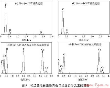 溶蝕孔隙主要是泥頁巖中方解石、磷灰石等碳酸鹽、磷酸鹽或硅鋁酸鹽在溶蝕作用下(主要是由于頁巖生烴過程中生成的有機酸或CO2溶于水形成碳酸,產(chǎn)生溶解作用)產(chǎn)生的孔隙。圖5為場發(fā)射電鏡和掃描電鏡下觀察到的礦物溶蝕孔隙。由圖5a可見磷灰石、方解石溶蝕后產(chǎn)生的大量溶蝕孔隙。圖5a中黃線標出的黑灰色區(qū)域C區(qū)對應的元素能譜見圖9c,區(qū)域內(nèi)鈣、氧、磷、碳元素含量較高,據(jù)此判斷溶蝕孔隙是磷灰石、方解石礦物溶蝕后產(chǎn)生,孔徑為10500nm。由圖5b可見充填于溶蝕孔隙中的柱狀石膏和粒狀黃鐵礦,孔徑為1002500nm。