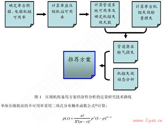 在西氣東輸二線管道工程中,提出了壓縮機組備用方案經(jīng)濟性分析的定量研究技術路線(圖 1)和計算方法。其中單臺燃驅(qū)、電驅(qū)機組的可用率根據(jù)管道運行單位的統(tǒng)計數(shù)據(jù)得出。