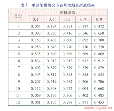 單純考慮太陽(yáng)直射輻射時(shí),單遮陽(yáng)板的外挑系數(shù)宜控制在0.3左右。