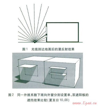 室內(nèi)的采光和視野。同一外挑系數(shù)下南向外窗分別設(shè)置單、雙遮陽(yáng)板的遮擋效果比較(夏至日10O0)見圖2。由圖2可知,設(shè)置雙遮陽(yáng)板也能加強(qiáng)對(duì)直射光的遮擋。當(dāng)直射光從非正南入射時(shí),第二遮陽(yáng)板能夠有效地削弱進(jìn)入室內(nèi)的太陽(yáng)直射光,并且能將投射到下遮陽(yáng)板的直射光以漫反射的形式投射到室內(nèi)深處,加強(qiáng)室內(nèi)深處的采光效果。