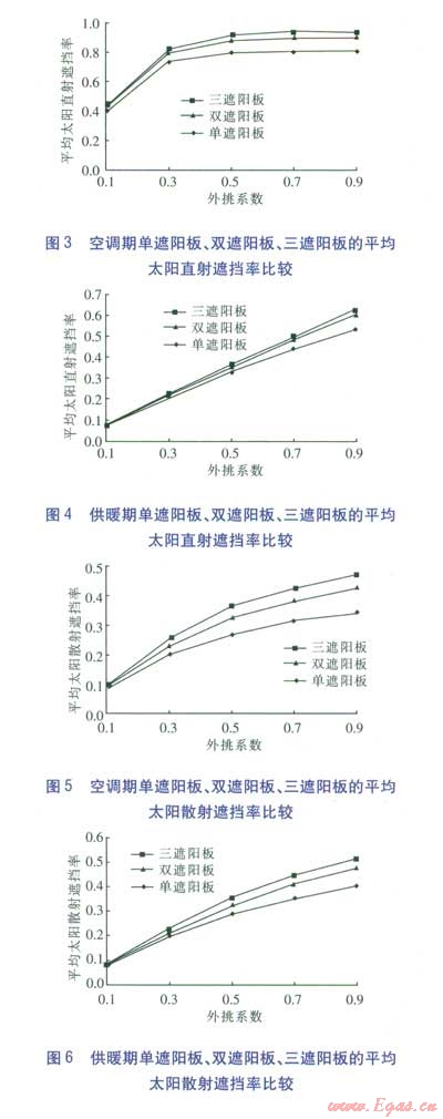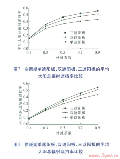 在相同外挑系數(shù)下,多遮陽(yáng)板的遮擋效果優(yōu)于單遮陽(yáng)板。