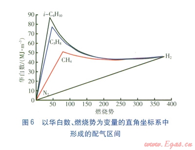 基于互換性原理進行的試驗氣配制,一般將甲烷、H2、N2三組分、丙(丁)烷、H2、N2三組分作為原料氣,控制試驗氣的華白數(shù)、燃燒勢、黃焰指數(shù)等關(guān)鍵燃燒特性指數(shù)與基準氣相等,并進行以華白數(shù)、燃燒勢為主要控制指標的配制設(shè)計[7],建立配制試驗氣的整體分布區(qū)間。以CH4、H2、N2三組分,C3H8、H2、N2三組分,n-C4H10、H2、N2三組分,i-C4H10、H2、N2三組分為原料氣,在以華白數(shù)、燃燒勢為變量的直角坐標系中形成的配氣區(qū)間見圖6。由圖6可知,各組原料氣形成的配氣區(qū)間邊界線并不全為直線,任兩種可燃氣體形成的配氣邊界線為指數(shù)曲線,而N2與H2、N2與另一種烷烴可燃氣體形成的配氣邊界線為直線。