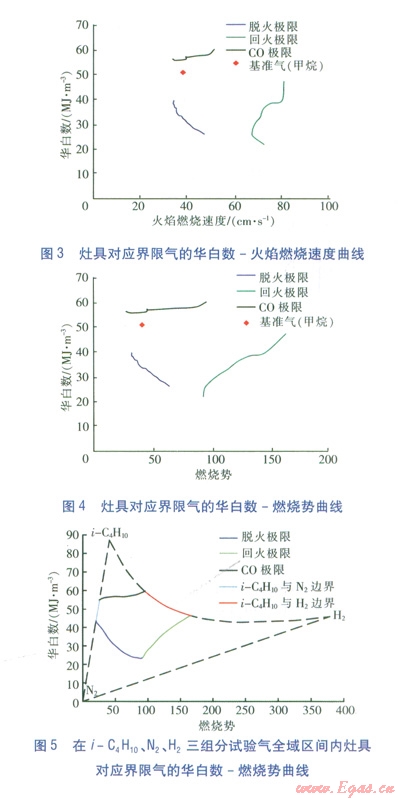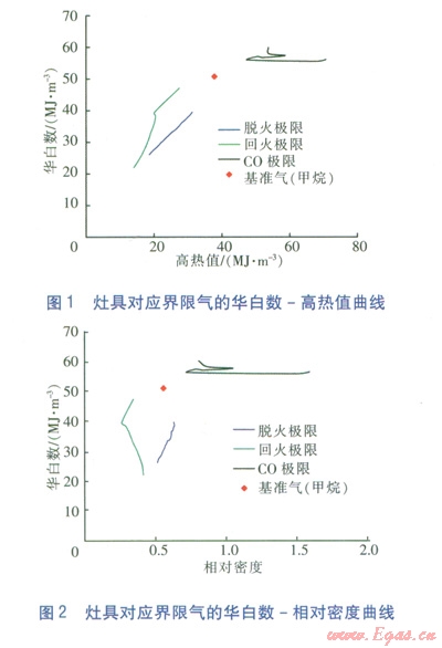 為了確定表征燃具適應(yīng)性的燃燒特性指數(shù),課題組建立了試驗裝置,選擇大氣式燃具(主要為家用燃氣灶具,包括嵌入式灶、臺式灶),進行了燃燒工況測試。分別測量灶具在脫火、回火、C0超標時的燃氣組成,由此計算各極限情況下的燃燒特性指數(shù)。并根據(jù)華白數(shù)、高熱值、相對密度、火焰燃燒速度、燃燒勢等關(guān)鍵指數(shù),繪制試驗數(shù)據(jù)圖形(直角坐標系),確定表征燃具適應(yīng)性的燃燒特性指數(shù)。