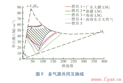 課題組探索形成了完整的試驗測定城市多氣源“共同互換域”的方法和技術(shù)路線,形成了量化、科學(xué)的城市多氣源互換性測試技術(shù)。5種常用大氣式燃具在i-C4H10、H2、N2三組分試驗氣全域區(qū)間中的共同適應(yīng)域(即多氣源的共同互換域,圖9中陰影部分),以及4種超出多氣源共同互換域的氣源見圖9.