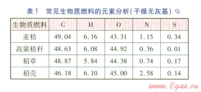 常見(jiàn)生物質(zhì)燃料的元素分析(干燥無(wú)灰基)見(jiàn)表1。由表1可知,生物質(zhì)燃料含碳量較少,質(zhì)量分?jǐn)?shù)一般小于50%,因此生物質(zhì)燃料不耐燒,發(fā)熱量較低。生物質(zhì)燃料含硫量很低,質(zhì)量分?jǐn)?shù)大多低于0.20%,甚至為零,因此燃用生物質(zhì)燃料的燃燒設(shè)備不必設(shè)置脫硫裝置,以降低設(shè)備造價(jià)。
