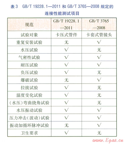 GB/T l9228.1-2011和GB/T 3765-2008規(guī)定的連接性能測(cè)試項(xiàng)目見表3,各項(xiàng)測(cè)試的具體條件及合格要求見相應(yīng)標(biāo)準(zhǔn)。
