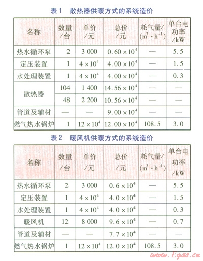 散熱器供暖方式:供暖時間按118 d計算,每天運行24 h,總運行時間為2 832 h。考慮室外溫度的變化,燃氣鍋爐額定負荷當量運行時間為2 000 h,其他設備的運行時間不變。