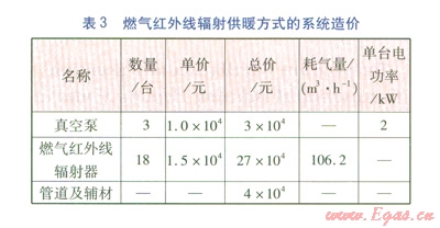 由以上分析可知,在3種供暖方式中,燃氣紅外線輻射供暖方式的系統(tǒng)造價及供暖期運行費最低。