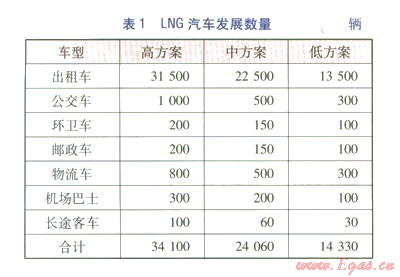根據(jù)各類(lèi)LNG車(chē)輛潛在用戶(hù)的特點(diǎn),對(duì)各類(lèi)LNG汽車(chē)發(fā)展數(shù)量及年用氣量進(jìn)行了高、中、低3種方案的預(yù)測(cè),分別見(jiàn)表1、2。