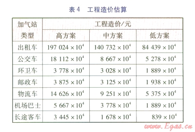 根據(jù)LNG車(chē)輛用戶(hù)的特點(diǎn)及北京市的實(shí)際情況確定加氣站的建設(shè),郵政車(chē)、物流車(chē)以及50%出租車(chē)的加氣站采用與規(guī)劃的加油站建合建站,分別進(jìn)行管理;公交車(chē)、環(huán)衛(wèi)車(chē)、機(jī)場(chǎng)巴士、長(zhǎng)途客車(chē)以及50%出租車(chē)的加氣站考慮改造有條件的已建加油站進(jìn)行聯(lián)合建站。各方案的工程造價(jià)估算見(jiàn)表4