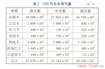 LNG公交車(chē)按照高、中、低3個(gè)方案分別發(fā)展1 000、500、300輛進(jìn)行估算。按日加氣80 m3(輛·d)、日行駛250 km(·d)、年行駛350 d(輛·a)進(jìn)行年用氣量的預(yù)測(cè)計(jì)算。