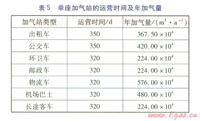 30%資本金考慮,其余為國(guó)內(nèi)商業(yè)銀行貸款,貸款利率為7.05%。單座加氣站的運(yùn)營(yíng)時(shí)間及年加氣量見(jiàn)表5。