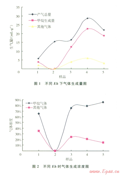 筆者在實(shí)驗(yàn)室條件下模擬了不同Eh條件下生物甲烷生成的情況,對(duì)不同條件下產(chǎn)出的氣體及甲烷含量進(jìn)行分析,并對(duì)甲烷在不同反應(yīng)階段的生成方式進(jìn)行了探討,實(shí)驗(yàn)結(jié)果表明: