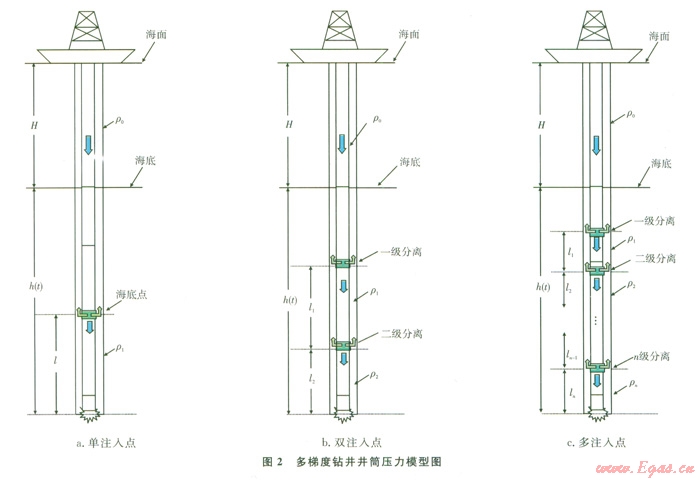 隨著陸上和淺海油氣資源的持續(xù)不斷開發(fā),勘探開發(fā)轉(zhuǎn)向海洋尤其轉(zhuǎn)向深水已成為必然。但與陸地和淺海鉆井相比,深水海域特殊的自然環(huán)境和復(fù)雜的油氣儲藏條件產(chǎn)生了常規(guī)鉆井裝備和工藝難以克服的技術(shù)難題[1]:采用錨泊定位鉆機(jī)本身必須承受笨重的錨泊系統(tǒng)的重量,給鉆機(jī)定位增加了難度;隔水管除了承受自身重量,還需要承受諸如海流及惡劣的海洋環(huán)境載荷;在海底泥線處的高壓和低溫環(huán)境對鉆井液性能影響;海底的不穩(wěn)定性、淺層水流動、天然氣水合物控制對鉆井的風(fēng)險(xiǎn);對于常規(guī)鉆井工藝,尤其難于控制井筒鉆井液循環(huán)當(dāng)量密度在允許的作業(yè)壓力窗口之間。針對井筒壓力控制難度較大的問題,國外20世紀(jì)90年代提出和發(fā)展的雙梯度鉆井技術(shù)[2]。目前已實(shí)施5個(gè)聯(lián)合工業(yè)項(xiàng)目,并取得了階段性成果[3],提出了多套技術(shù)方案,包括海底泵舉升鉆井液、隔水管氣舉、隔水管稀釋以及注空心玻璃球(Hollow Glass Spheres,簡稱空心球)等,以實(shí)現(xiàn)井筒壓力的優(yōu)化控制。本文基于雙梯度鉆井技術(shù),提出了多梯度鉆井技術(shù),該技術(shù)比雙梯度鉆井能更好地匹配地層壓力,使井底壓力在較長的距離內(nèi)介于地層壓力和破裂壓力之間,能夠簡化深水復(fù)雜井身結(jié)構(gòu),有效控制井筒環(huán)空壓力,實(shí)現(xiàn)安全鉆進(jìn),同時(shí)提高鉆進(jìn)效率。