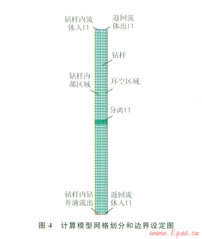 井下多相流分離的順利實(shí)施是多梯度鉆井技術(shù)實(shí)現(xiàn)的關(guān)鍵。采用FLUENT混合物(Mixture)模型[7-8]建立空心球注入模型,網(wǎng)格劃分及邊界條件如圖4所示。假設(shè)混合了空心球的鉆井液是不可壓縮流體,由于正常鉆進(jìn)時(shí)鉆井液的流量基本恒定,可假定鉆井液的流動是定常流動。在直角坐標(biāo)中混合流體的運(yùn)動控制方程[9]: