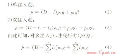 根據(jù)鉆井實(shí)際的需要可以設(shè)置一個(gè)或多個(gè)注入點(diǎn),這些注入點(diǎn)位置可以固定,也可以隨鉆柱移動而移動。井底壓力(p)為: