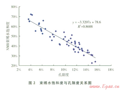 常規(guī)測井解釋可動水飽和度的原理如下:①根據(jù)核磁共振技術(shù)標定巖樣束縛水飽和度(原始含水飽和度減去可動水飽和度)與孔隙度之間的關(guān)系(圖2);②在各個深度點,根據(jù)常規(guī)測井解釋出的孔隙度計算出束縛水飽和度;③將常規(guī)測井解釋出的原始含水飽和度減去束縛水飽和度,得到該深度儲層的可動水飽和度,從而繪制出可動水飽和度縱向分布曲線。