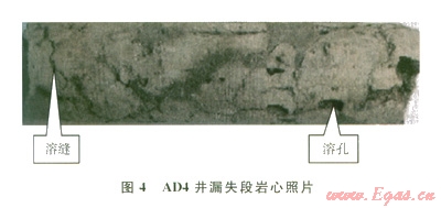 塔河油田l2區(qū)探井AD4井,處于構造洼地,AD4井南面發(fā)育有東西向斷裂,東面發(fā)育有南北向斷裂。地震資料顯示井區(qū)T47界面附近有強振幅串珠狀異常反射(3)。振幅變化率處理成果統(tǒng)計分析表現(xiàn)為強振幅變化率,相干屬性為較弱相干。鄰井鉆井完井資料顯示,7 口井中有2口在奧陶系一問房組發(fā)生漏失(其中TKl013井共漏失鉆井液905 m3,溢流153.55 m3),2口在恰爾巴克組發(fā)生漏失。鄰井巖心分析顯示,巖石主要成分為泥微晶顆?;?guī)r,測試顯示供液能力50 m3d左右。