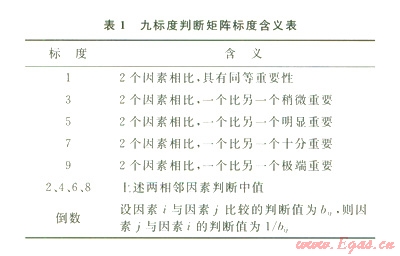 采用九標度法(1),對每一結構層次內(nèi)各因素兩兩比較其重要性,并把比較結果通過合適的標度表示出來,寫成矩陣形式,即為判斷矩陣。