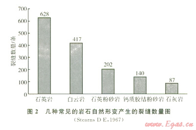 巖石在構造應力作用下會發(fā)生變形,當變形超過破裂強度時巖石將發(fā)生破碎,產(chǎn)生裂縫。不同的巖石在相同的應力作用下形變不同,產(chǎn)生的裂縫數(shù)也不相同,即強度決定巖石裂縫的多少(2)。