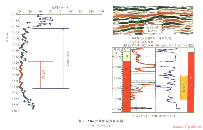 鉆井完井過程中,在奧陶系一間房組6 486.02 m發(fā)生井漏,在鉆進過程中發(fā)生間斷性漏失。其中6 491.866 541.0 m段為主要井漏段,其中6 518.006 541.00 m段強行鉆進過程中,鉆壓060 kN,鉆進液漏失速率4460 m3h,鉆時一般維持在25minm,部分井段鉆時1 minm,故認為此段為放空段,漏失段長23 m。隨后發(fā)生多次溢流,經(jīng)多次壓井才順利完鉆,共漏失鉆井液7 042 m3。最大漏速70 m3h,平均漏速40.9 m3h。地震、測井資料均顯示此段漏失嚴重(3)。